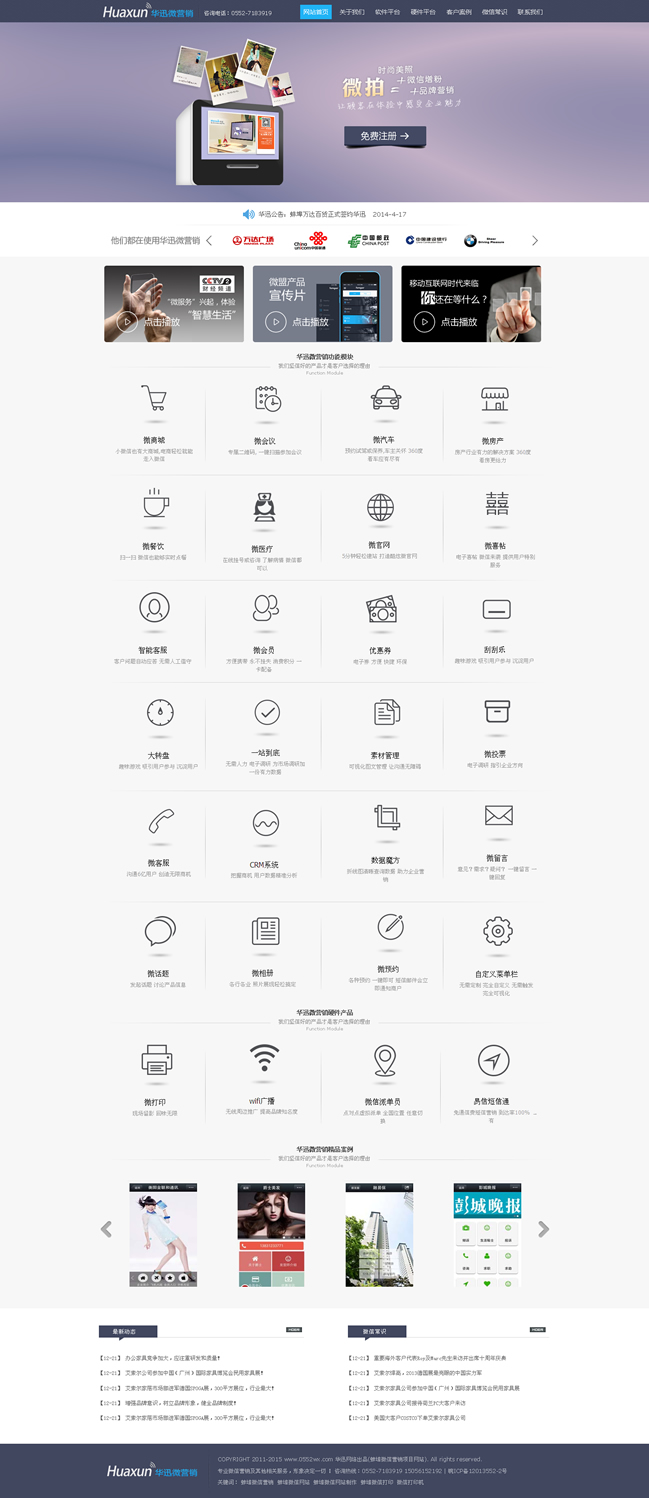 華迅網(wǎng)絡(luò)是打造一個(gè)專門針對(duì)微信公眾賬號(hào)提供營(yíng)銷推廣服務(wù)的第三方平臺(tái)。主要功能是針對(duì)微信商家公眾號(hào)提供與眾不同的、有針對(duì)性的營(yíng)銷推廣服務(wù)。通過華訊微網(wǎng)站平臺(tái),用戶可以輕松管理自己的微信各類信息,對(duì)微信公眾賬號(hào)進(jìn)行維護(hù)、開展智能機(jī)器人、在線發(fā)優(yōu)惠劵、抽獎(jiǎng)、刮獎(jiǎng)、派發(fā)會(huì)員卡、打造微官網(wǎng)、開啟微團(tuán)購等多種活動(dòng),對(duì)微信營(yíng)銷實(shí)現(xiàn)有效監(jiān)控,極大擴(kuò)展?jié)撛诳蛻羧汉蛯?shí)現(xiàn)企業(yè)的運(yùn)營(yíng)目標(biāo)。華迅微網(wǎng)站平臺(tái)很好的彌補(bǔ)了微信公眾平臺(tái)本身功能不足、針對(duì)性不強(qiáng)、交互不便利的問題,為商家公眾賬號(hào)提供更為貼心的、且是核心需求的功能和服務(wù)。在線優(yōu)惠劵、轉(zhuǎn)盤抽獎(jiǎng)、微信會(huì)員卡等推廣服務(wù)更是讓微信成為商家推廣的利器。智能客服的可調(diào)教功能讓用戶真正從微信繁瑣的日?头ぷ髦薪饷摮鰜,真正成為商家便利的新營(yíng)銷渠道。